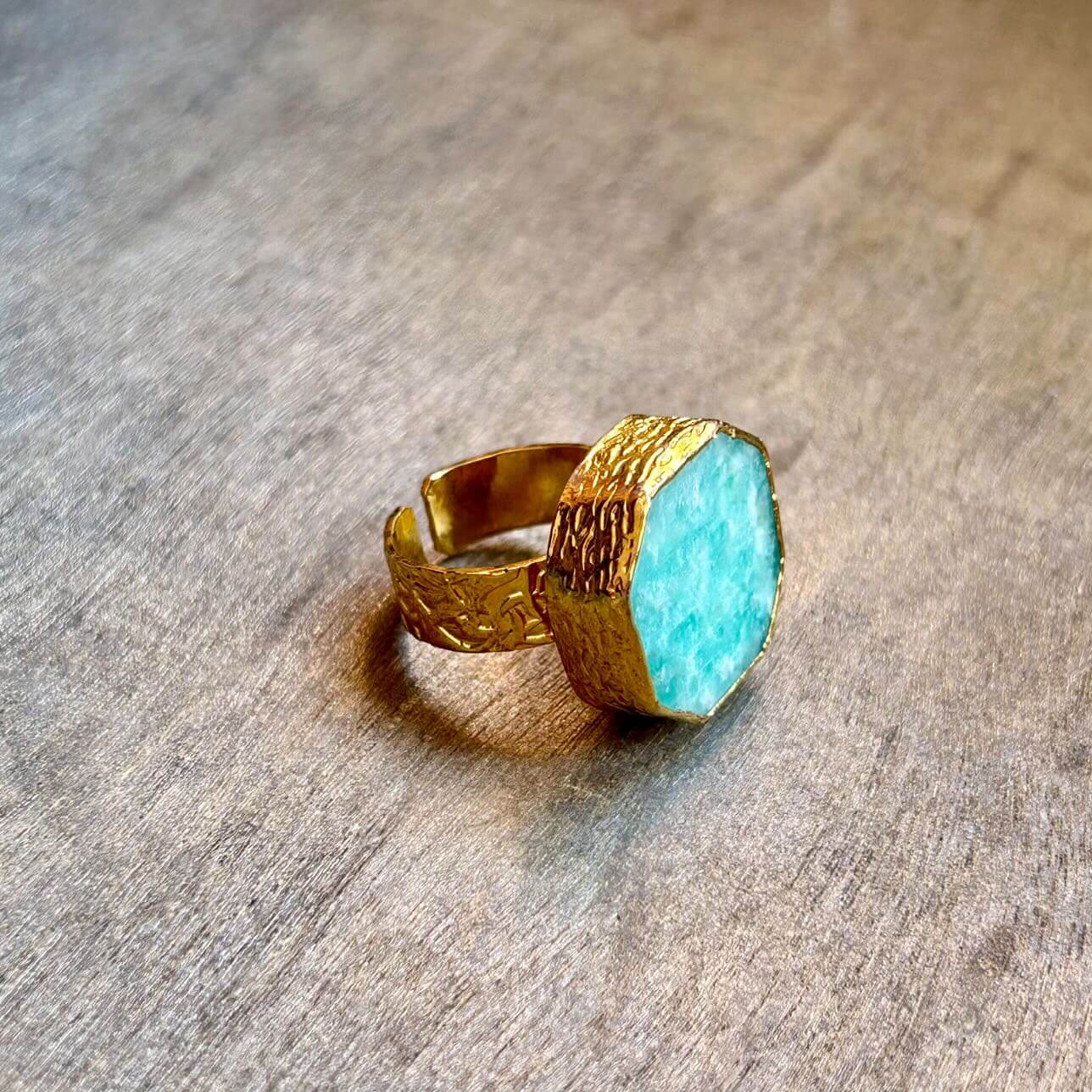Anillo en Amazonita y Peltre con Baño de Oro de 18k.