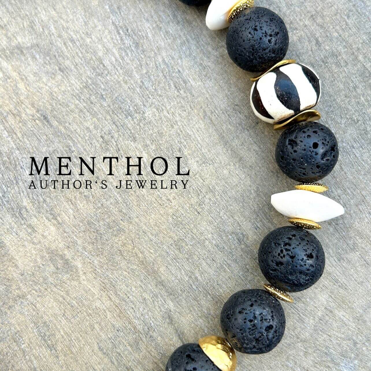 Está elaborado a mano en Piedra Volcánica, Hueso y Madera de Kenia y Peltre con Baño de Oro de 18 quilates, ofreciendo una estética única.