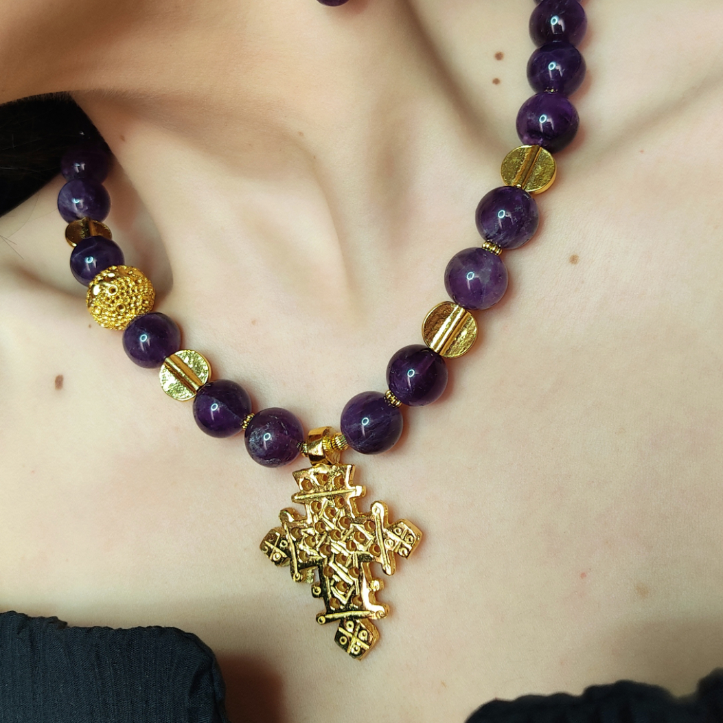 El Collar Minor presenta una cruz de diseño elegante y está elaborado en Amatista, Peltre y Bronce con Baño de Oro de 18 quilates.