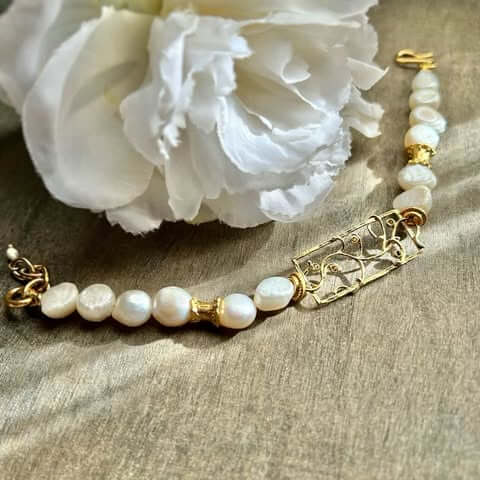 Pulsera de perlas de agua con pieza central rectangular en peltre y baño de oro de 18 quilates. Luz, equilibrio y elegancia atemporal.