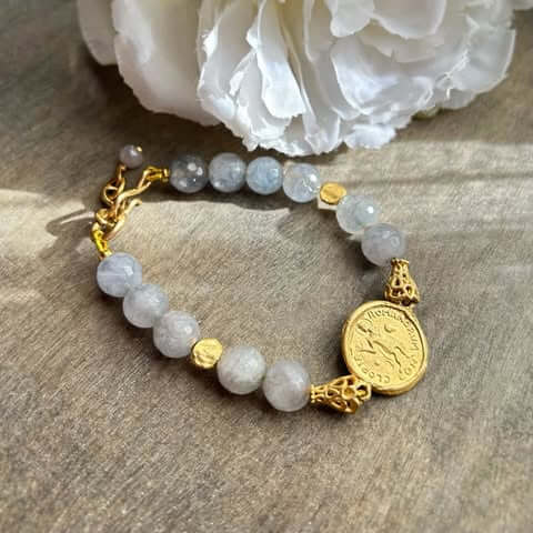 La pulsera Roma combina una moneda de inspiración romana con Ágata y Peltre con Baño de Oro de 18 quilates, creando una pieza elegante y atemporal llena de carácter e historia.